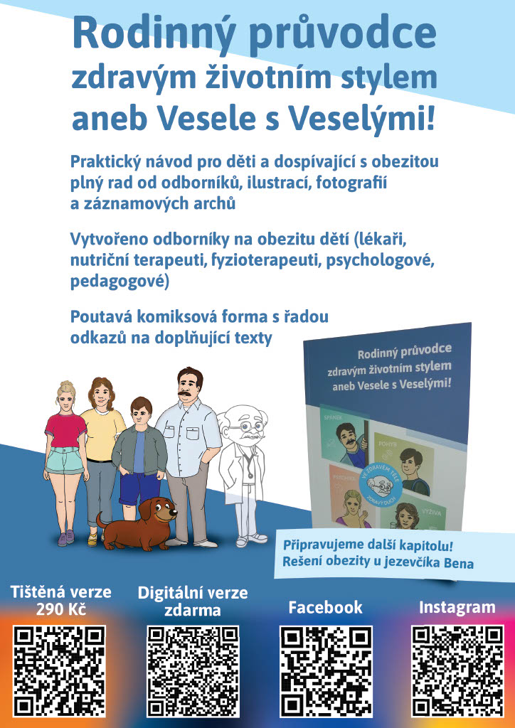 Před více než rokem proto vznikla zdarma dostupná brožura Rodinný průvodce zdravým životním stylem aneb Vesele s Veselými!, která srozumitelnou a přívětivou formou přibližuje rodinám, jak mohou ve svém každodenním životě podpořit zdravější návyky. Čtenáře provází příběh rodiny Veselých, doplněný ilustracemi a praktickými tipy – od inspirace pro vyvážený jídelníček přes podporu pravidelného pohybu až po drobné změny, které mohou v rodinném režimu znamenat velký rozdíl. Při finalizaci brožury jsme si uvědomili, že v příběhu chybí jeden důležitý člen mnoha domácností – pes. Proto jsem se rozhodli publikaci letos rozšířit o novou kapitolu věnovanou problematice obezity u psů. Ve spolupráci s veterinárními lékaři vznikla část zaměřená na rizika obezity, prevenci i možnosti řešení. Zdravá rodina totiž zahrnuje i své čtyřnohé členy.